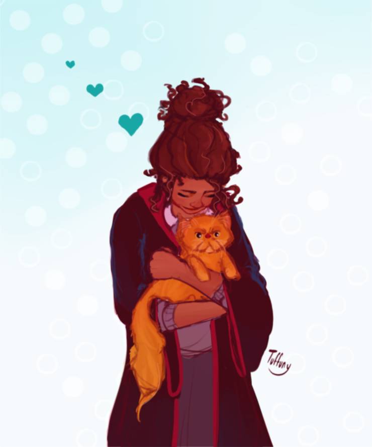 Fan Art of Harry Kisses Hermione for fans of Harry Potter cute. This fan art picture is a simple sketch of the Harry Potter crew The artist decided to draw Hermione Granger with a bunch of books in her cloak (which is very accurate to what her character is like) The artist also drew a tiny mouse on Ron Weasley‘s shoulder as an added detail 6 Harry Potter And His (Super Round) Pet Owl. This wonderful and lively fan art has captured the moment Hermione casts the Patronus Charm Hermione's Patronus is an otter, one of JK Rowling's favorite animals Its luminous lighting casts a blue glow over the entire image, enhancing the magical feel.