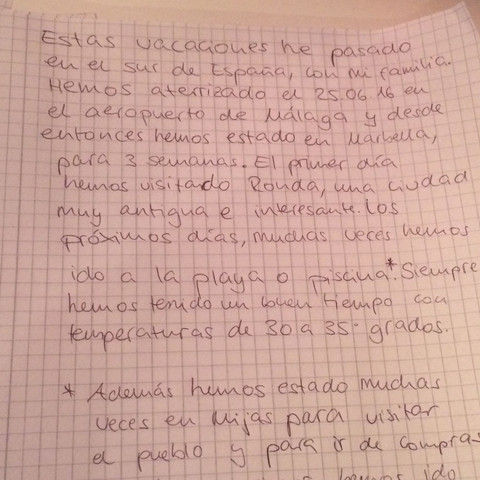Kürzest Überblick über die spanische Geschichte Begriffe Republik Monarchie Schema Weltanschauungen Extremismisten lehnen Pluralismus ab Begriffe liberaler Verfassungsrechtsstat, ***** Anarchie;. Spanisch text über letzte ferien indefinido hallo, Ich schreibe morgen eine spanisch klausur und muss einen text im spanischen über meine letzten ferien schreiben und was ich da gemacht habe Ich hoffe mir kann jemand helfen Meine letzten Ferien war ich mit meiner Familie 3 Wochen bei unseren Sommerhaus in Schweden. Fragen über den Stundenplan spanischer Schüler beantworten ihren eigenen Stundenplan mit dem spanischer Schüler vergleichen Fragen zum Text beantworten Informationskärtchen über einen Text erstellen Hör/HörSehVerstehen verstehen welche Person welche Lieblingsfächer hat.