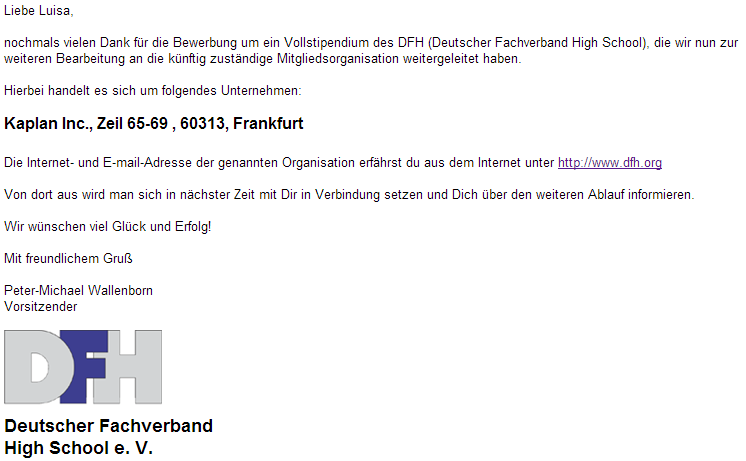 06 – 07 Scholarship, Deutscher Fachverband Highschool eV (German Association for High School Exchanges) Test Scores TOEFL iBT Score 99th percentile. •High quality due to Rigorous quality standards and controls Professionalism of providers and language schools High acceptance of FDSV member programs Fachverband deutscher Sprachreiseveranstalter/ Association of German Language Travel Providers. Deutscher Fachverband High School DFH (12 Teilstipendien à 5000, Euro) Stipendienlotse Informationen des Bundesministeriums für Bildung und Forschung (BMBF) Das Bildungskreditprogramm der Bundesregierung Das Programm soll Schüler/innen durch einen einfachen und zinsgünstigen Kredit eine gezielte finanzielle Unterstützung gewähren.