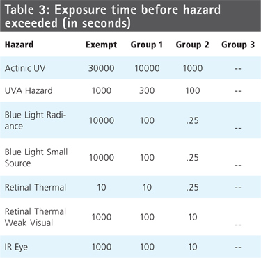 IEC "Photobiological safety of lamps and lamp systems Part 2 Guidance on manufacturing requirements relating to nonlaser optical radiation safety" provides further guidance on the measurement and labeling of sources and is a useful supplement to IEC/EN (Table 4).