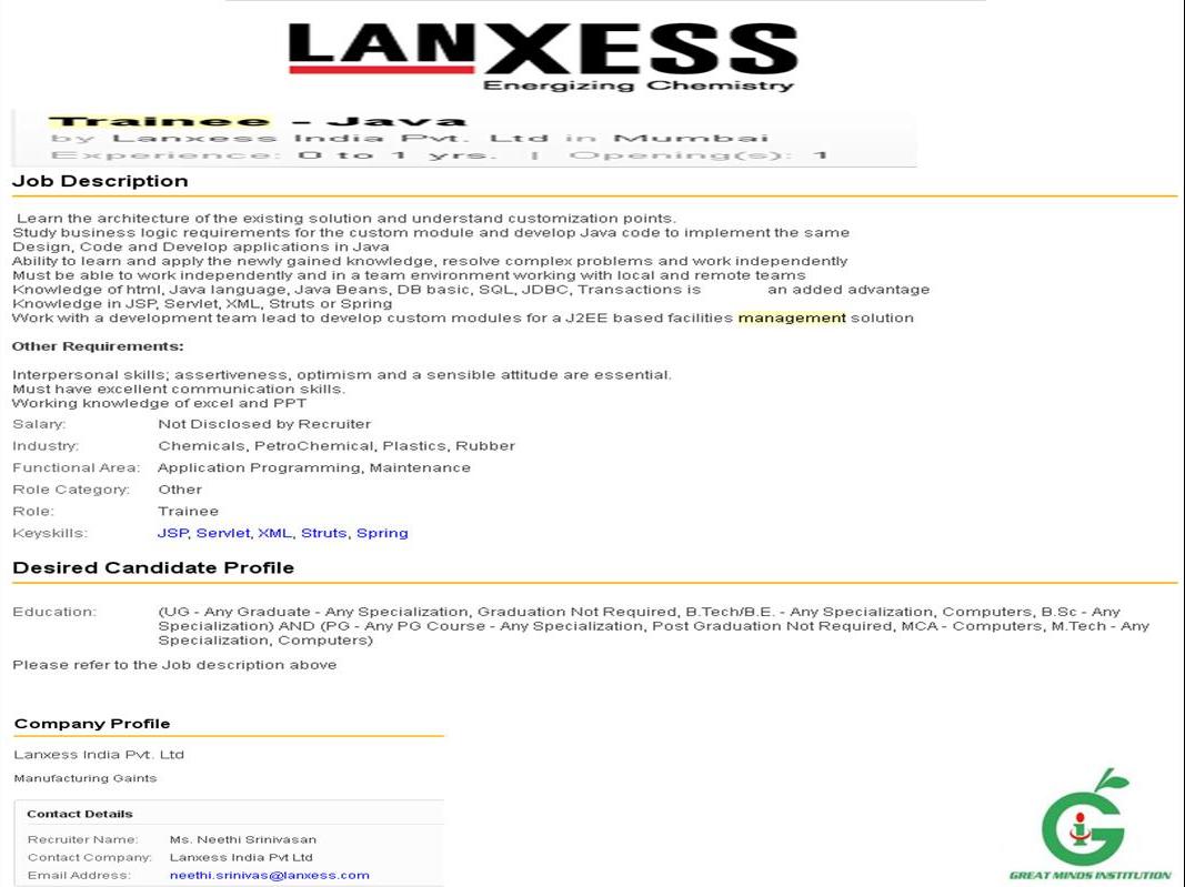 Finden Sie Jobs bei LANXESS 52 offene Stellen bei LANXESS mit Bewertungen, Erfahrungsberichten und Gehältern, anonym von LANXESS Mitarbeitern gepostet. Trainee programs Exciting tasks and intensive personal support This is precisely what LANXESS offers qualified university graduates in subjectrelated training programs Over a period of up to 18 months you work through different departments, actively shaping the program as you go with optional assignments. LANXESS stands for excellence in chemistry, and we're just as committed to health, safety, and the environment Resonsible Care® is a registered trade mark of the American Chemisty Council Corporate Responsibility LANXESS.