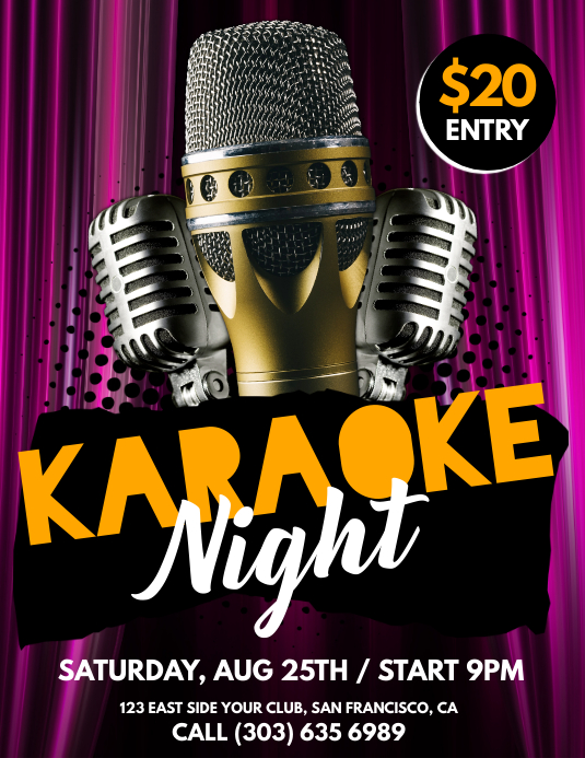 Hosting a karaoke night in your establishment can bring in crowds, both young and old to enjoy the festivities Use the Karaoke Night Flyer from MustHaveMenus featuring a vivid gradient background and plenty of room for your details Add your own text, logo and any other important information to make a gorgeous design with minimal effort. This is a modernlydesigned Karaoke Night Flyer Template which is perfect for promoting and advertising an upcoming microphone event, night club event or talent show The template is divided into wellorganized layers to facilitate easy editing and customization. Karaoke party invitation, karaoke birthday party, gold karaoke night flyer, karaoke bar invitations, karaoke invite, karaoke invitation TWorldDesigns From shop TWorldDesigns 5 out of 5 stars (217) 217 reviews $ 1500 FREE shipping Favorite Add to.