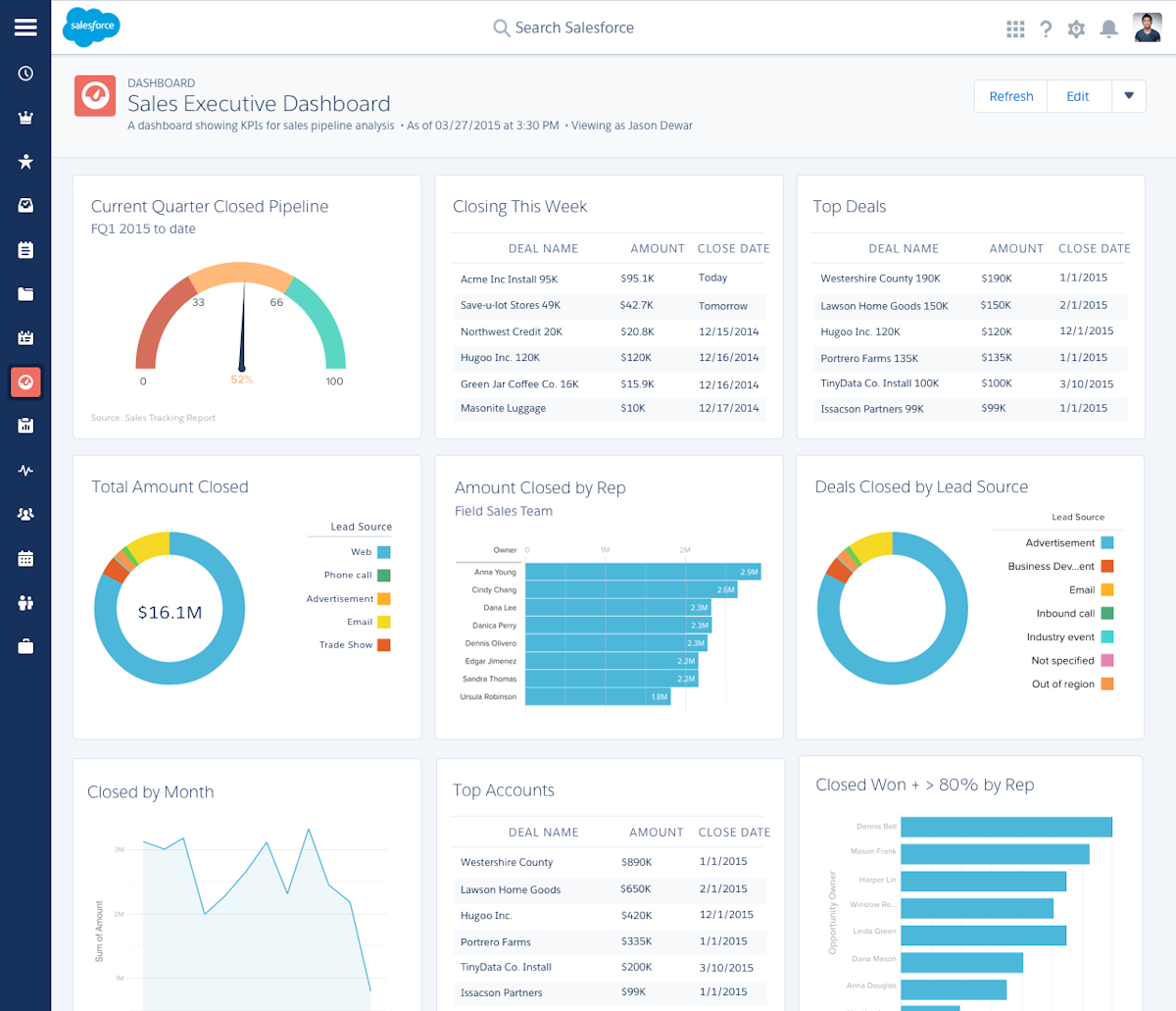 Salesforce dashboards usually show a broadbased view of data, which is not suitable for the average sales rep On the other hand, HubSpot allows reps to stay focused on their pipeline, thus allowing them to get their job done smoothly. With CRM software features and benefits from Salesforce, Sales Force Automation (SFA Software) from Salesforce is the most widely used of sales tools and sales automation software, speeding and streamlining all phases of sales from lead management to analytics and forecasting. Salesforce Dashboard Template This article has examples of the 12 charts that should be on every sales manager’s Salesforce dashboard It’s a dashboardlovers template for success These dashboard charts (together with their underlying reports) deliver tremendous visibility into the sales pipeline and sales performance.