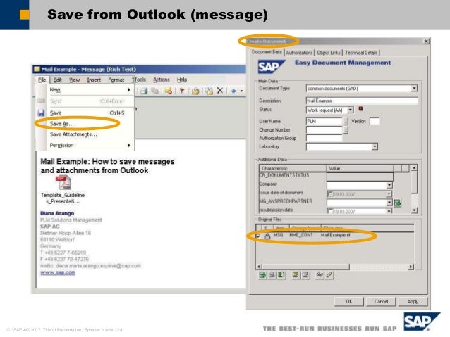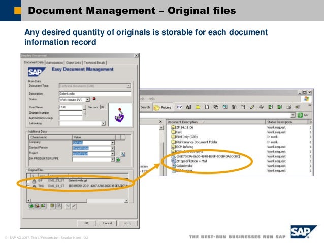 Related Articles for SAP Document Management System Table SAP S/4 Hana Finance Tutorial – Learn SAP Simple Finance;. Verwendung Wenn Sie das SAP Easy Document Management im Microsoft Windows Explorer öffnen, wird eine Verbindung zum SAPSystem über die Schnittstelle des SAP Easy Document Management erstellt Immer wenn Sie das SAP Easy Document Management im Microsoft Windows Explorer aufrufen, ändert sich der Aufbau der Symbolleiste. SAP Easy Document Management supports you by letting you use the extensive functions of SAP Easy Document Management without having detailed knowledge of SAP Document Management You can create public and private folders, which are documents in SAP document management, in hierarchical structures, and then save your files there.