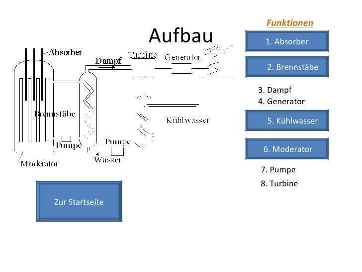 Das Kernkraftwerk bei wwwstromonlinech Sehen Sie sich das Schaubild an und lesen Sie die Information darunter Klicken Sie dann auf “Infos”, danach auf “Interaktiv”, und schließlich auf “Quiz”. Geringe Neigung zum Einfang von Neutronen Bei welchem Stoff ist die Neigung, Neutronen zu absorbieren, besonders klein?. Moderator in nuclear reactors Moderator {m} in Atomreaktorenphys nuke esp Am coll nuclear power plant Atomkraftwerk {n}nucl SCRAM emergency shutdown of a nuclear reactor acronym for safety control rod axe man, safety cut rope axe man Reaktorschnellabschaltung {f} nucl.