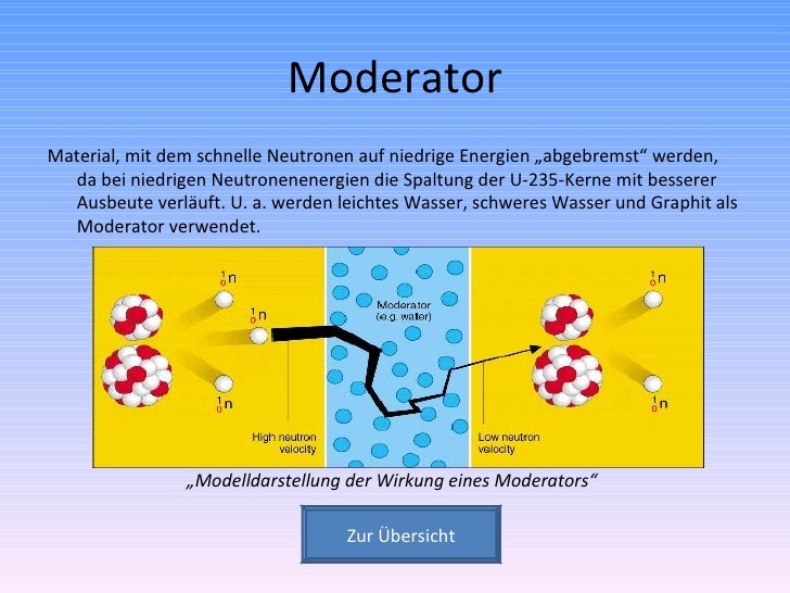 Das Problem der meisten Meetings ist das Fehlen eines Moderators Einige nützliche Basics zu der Rolle und den Aufgaben des Moderators finden Sie hier. Moderator Bei der Spaltung von den U235Kernen entstehen immer 23 schnelle Neutronen Diese schnellen Neutronen können die U235Kerne nur mit geringer Wahrscheinlichkeit spalten Also müssen die schnellen Neutronen durch geeignete Bremsmittel gebremst werden, weil langsame Neutronen die U235Kerne sehr leicht spalten können Die Bremsmittel. Das Kernkraftwerk bei wwwstromonlinech Sehen Sie sich das Schaubild an und lesen Sie die Information darunter Klicken Sie dann auf “Infos”, danach auf “Interaktiv”, und schließlich auf “Quiz”.