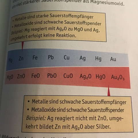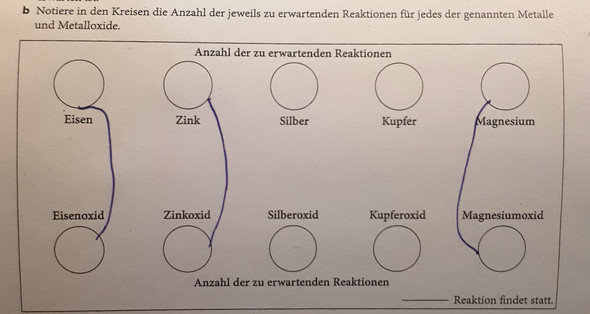 Der Versuch eignet sich dazu, die SuS eine Affinitätsreihe der Metalle zu Sauerstoff erstellen zu lassen Es können auch bereits die Begriffe edel und unedel eingeführt und auf die Reaktionsenergie eingegangen werden Auch im Alltag erfreuen sich Menschen an der Reaktion von Metallpulver mit Sauerstoff Das. Ich bin gerade in der 8ten Klasse im Gymnasium und verstehe folgende Aufgabe nicht Notiere in den Kreisen die Anzahl der jeweils zu erwartenden Reaktionen für jedes der genannten Metalle und Metalloxide Im Anhang ist ein Bild von dem Schema vorhanden. Anmeldung Nutzer Kennwort Warum muss ich mich anmelden?.