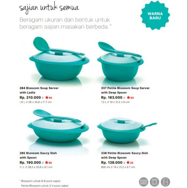 A Blossom Oval Sever (1 pcs) b Blossom Serving Platter (1 pcs) c Blossom Soup Server (1 pcs) d Blossom Saucy Dish (1 pcs) e Bonus Blossom Bowl (2 pcs) atau Blossom Spoon (2 pcs) / Booklet Kode 336 Petite Blossom Harga katalog Rp Discount 30% Jadi Rp Produk yang di dapat a Petite Blossom Soup Server with Deep. Gunakan Tupperware Blossom Soup Server with Ladle yang akan memudahkan Anda menyajikan makanan di rumah Wadah cantik ini didesain khusus sehingga ideal untuk menyajikan sop, sayur, atau makanan berkuah lainnya. Pastikan Petite Blossom Soup Server sudah kering sebelum disimpan Produk Tupperware dilindungi oleh Tupperware Lifetime Warranty / Garansi Seumur Hidup Tupperware Hal ini berarti, jika produk Tupperware rusak atau cacat dalam pemakaian normal non komersial (sesuai dengan fungsinya), maka dapat diklaim untuk mendapatkan penggantiannya secara gratis di distributor terdekat.