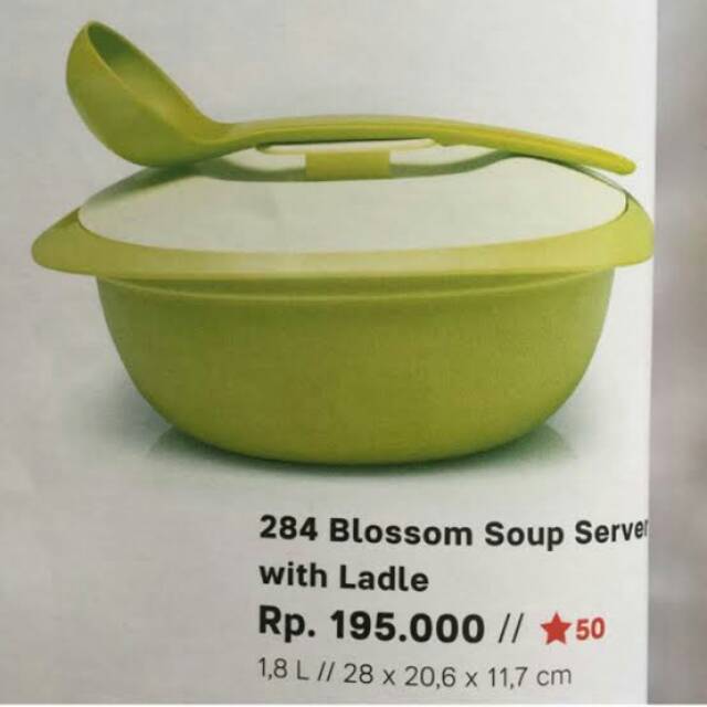 Blossom Soup Server with Ladle Rp Add to Cart Wadah Saji Yang Ideal Untuk Menu Berkuah Banyak Ukuran 18 L // 28 x 6 x 117 cm Fitur Desain Yang Pas Untuk Menu Berkuah Banyak. 1 Blossom Oval Server with Colander & Spoon (1) 1,8L/ 32,3 x ,5 x 10,3 cm 2 Blossom Serving Platter & Spoon 600ml/ 32,3 x ,6 x 6,5 cm 3 Blossom Soup Server with ladle 1,8L/ 28 x ,6 x 11,7 cm 4 Blossom Saucy Dish & Spoon 1,1L/ 28,3 x ,6 x 9,1 cm Bonus Blossom Bowl (2) @ 350 ml / Ø 13 cm;. Harga katalog 515rb Note Barang sesuai foto isinya maupun dusnya a Petite Blossom Soup Server (1) 12 L // p 19 cm, l 212 cm, t 9 cm b.