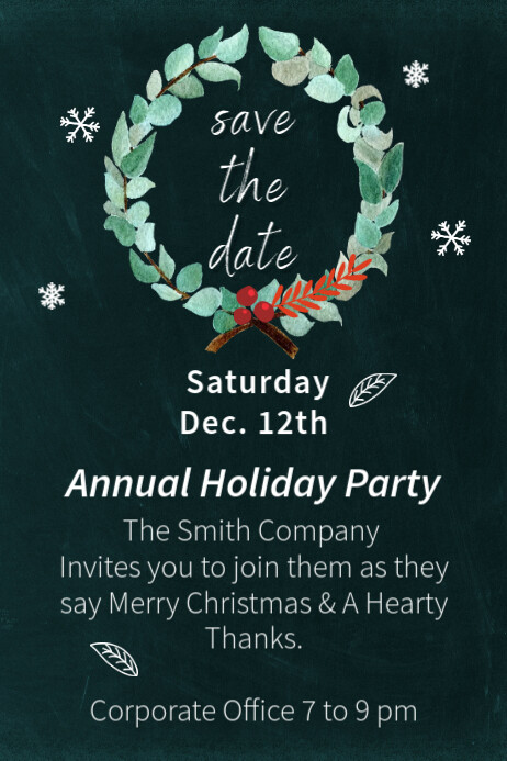 Holiday Party Save The Date Winter Wonder Gold Announcement St Michael The Archangel Stained Glass Window Business Card FLORAL , blue pink green Announcement Watercolor Pinecones Save The Date Christmas Party Announcement Blue and Gold Save the Date Business Holiday Event Announcement. 7pm Pot luck and White elephant gift exchange More details to come Chester approves. Get inspired by 4 professionally designed Holiday Save the Date Magnets templates Customize your Save the Date Magnets with dozens of themes, colors, and styles to make an impression Absolutely guaranteed.