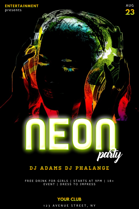This flyer is perfect for any party with DJ and club parties!. Online Poster Design Maker with Neon Words Over 7 million templates sold!. Our website uses images, trademarks and names of third party products which are the property of their respective owners.