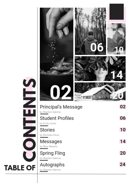 The table of contents is one of the first pages the readers see after opening a magazine, which makes it a great opportunity to reel them in with an original design Creative table of contents examples How to design your table of contents There are 4 secrets for designing a creative table of contents for a magazine, cookbook, or catalog. Mar 13, 15 Explore Laura Gonzalez's board "Layout" on See more ideas about table of contents design, magazine layout, contents design. Write the page numbers for each heading without fail;.