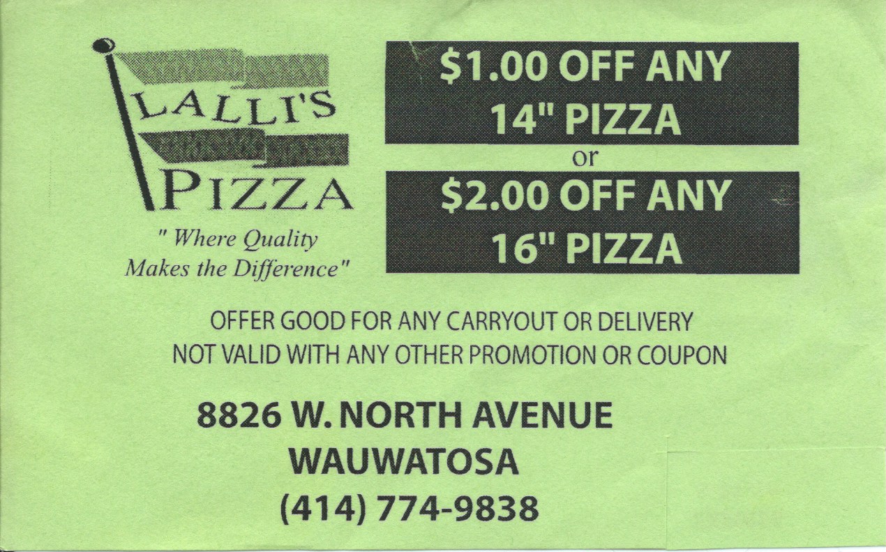 4th Stop Lalli’s Pizza 86 W North Ave, Wauwatosa (414) Lallispizzacom You haven’t had a true Tosa pizza experience until you’ve had Lalli’s A local favorite and mainstay on North Avenue long before the likes of Thainamite and Bel Air Tacos moved to town, Lalli’s offers delicious pizza and Italian food in a quaint and. Ob FleischFreund oder Vegetarier, ob herzhaft oder mild wählen Sie aus unserem umfangreichen kulinarischen Angebot an frischen Speisen Von original italienischer Pizza bis schmackhafter Pasta, von herzhaftem Fleisch bis knackigem Salat – bei uns kommt jeder auf seinen Geschmack!. 4th Stop Lalli’s Pizza 86 W North Ave, Wauwatosa (414) Lallispizzacom You haven’t had a true Tosa pizza experience until you’ve had Lalli’s A local favorite and mainstay on North Avenue long before the likes of Thainamite and Bel Air Tacos moved to town, Lalli’s offers delicious pizza and Italian food in a quaint and.