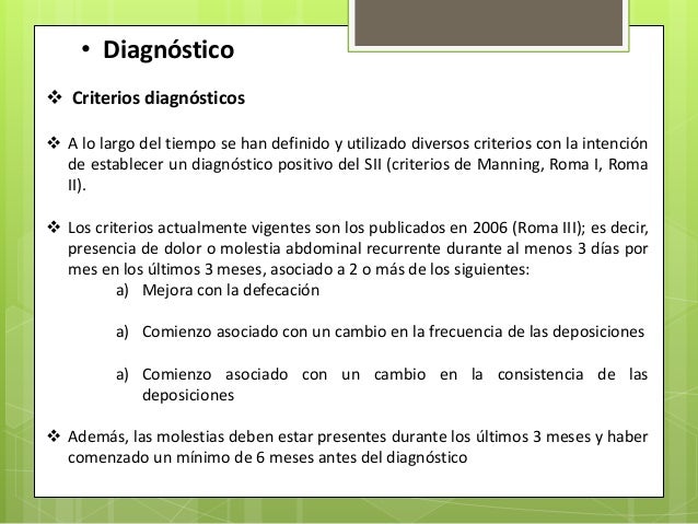 Tratamiento para el síndrome de intestino irritable (Instituto Nacional de la Diabetes y las Enfermedades Digestivas y Renales) También en inglés Tratamientos para el síndrome del colon irritable varían dependiendo la persona (Administración de Alimentos y Medicamentos) También en inglés. Colon irritable causas, síntomas y tratamiento Padecer dolor de vientre, gases y diarrea puede significar sufrir el síndrome del intestino irritable Hay personas que tienen molestias diarias en forma de gases, diarrea y dolor abdominal En estos casos no hay que descartar que estos síntomas correspondan al síndrome del colon irritable. Diagnóstico y Tratamiento del Intestino Irritable en el Adulto 4 2 Definición y Contexto El síndrome del intestino irritable (SII) se define como una afectación crónica de dolor o molestia abdominal asociado a alteraciones en el hábito intestinal, durante al menos 3 días por mes en los últimos 3 meses, sin causa orgánica que lo.