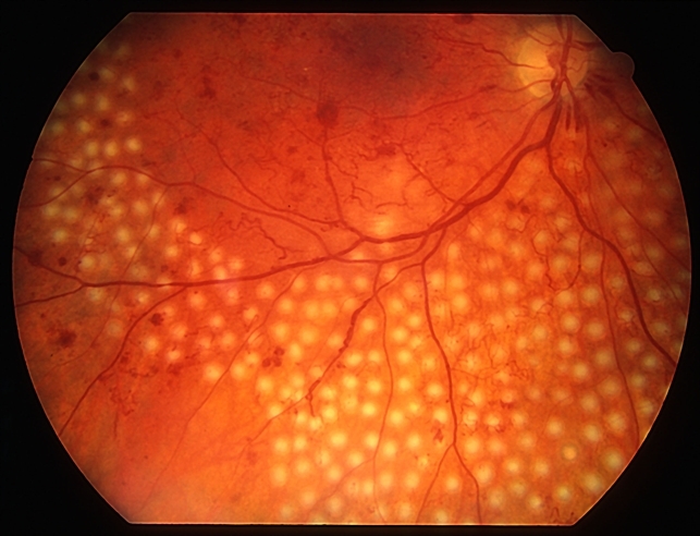 Stock Image Retinal Photograph Of Advanced Proliferative Diabetic Retinopathy Pdr Treatment Advanced Pdr Requires Aggressive Treatment With An Argon Laser Here Panretinal Scatter Laser Photocoagulation Shown As Peripheral Spots And Focal Argonlaser