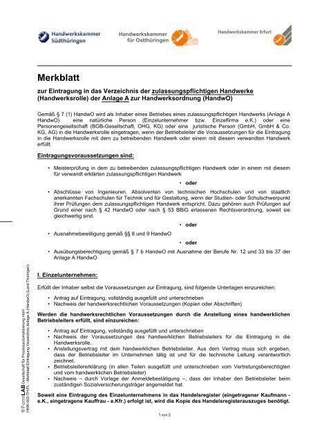 Merkblatt Zur Eintragung In Das Verzeichnis Der Hwk Gera