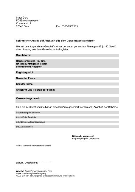 Www Gera De Fm 193 Schriftlicher antrag auf auskunft aus dem gewerbezentralregister E2 80 93 juristische person Pdf