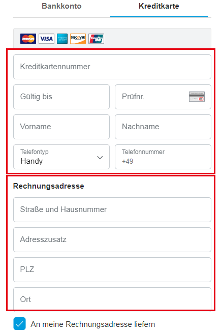 Rechnungsadresse kreditkarte. Muss die Rechnungsadresse mit der Adresse, unter der meine Kreditkarte registriert ist, übereinstimmen?. Deutschland Kreditkarte Die Abbuchung von Deiner Karte wird automatisch von unserem Finanzdienstleister ADYEN veranlasst Bei entsprechender Verifizierung Deiner Daten kann mit der Bearbeitung Deiner Bestellung sofort begonnen werden. Können Bestellungen auch ohne Kreditkarte ausgeführt werden?.