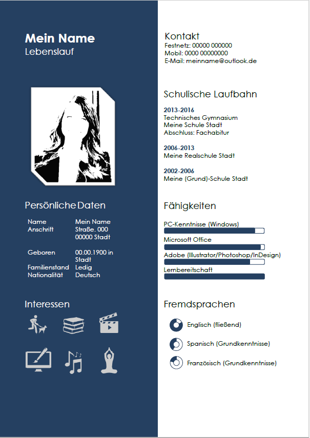 Bleiben Sie schlicht Außer wenn Sie sich für eine Stelle als Grafiker oder Kreativer bewerben und Software wie InDesign verwenden, sollten Sie bei Ihrer Präsentation lieber schlicht bleiben Idealerweise entspricht die Form Ihrer Bewerbung Ihrer Persönlichkeit Wählen Sie eine lesbare Schriftart. Der Lebenslauf ist mit Abstand der wichtigste Teil deiner Bewerbung Er entscheidet darüber, ob der Recruiter dein Bewerbungsschreiben durchliest oder nicht, daher ist es wichtig, dass alle wichtigen Bestandteile inkludiert sind und der Aufbau stimmt Wir haben hier ein paar Tipps zusammengestellt, wie du deinen Lebenslauf aufbauen könntest. Beispiele und Vorlagen für einen perfekten französischen Lebenslauf Einige Modelle erfordern zusätzliche Anpassungsarbeit mit Photoshop oder Indesign Die meisten Vorlagen sind im DOCXFormat und können daher auch mit dem Textbearbeitungsprogramm Word geändert werden Einfach, schlicht und sehr gelungen LebenslaufVorlage für.