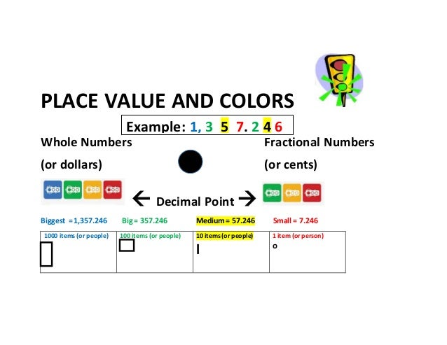 The same applies to larger numbers In this case, we have eleven dollars and fiftyseven cents ($1157) A dollar is a whole amount and is written to the left of the decimal Cents are parts of a dollar and we write them to the right of the decimal. Do not assume that students understand decimals if they can work with money Often students see the 'dot' in, for example, $315 as a separator between dollars and cents They do not see it as having to do with place value and decimals The following approach helps students see the connection between money and decimal tenths and hundredths $132. Read the number after the decimal point and say âcentsâ The numbers after the decimal point describe the amount of money that doesnât make up a full dollar Read the number after the decimal point as a whole number on its own Say âcentsâ after the word to distinguish it from the first number.