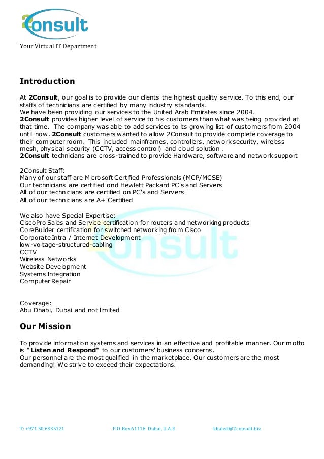 Simply put, your company profile is a professional introduction and aims to inform people (primarily prospective buyers and stakeholders) about your products, services, and current status, yes b ut that doesn't mean you should settle for something boring Below are 10 examples that will help you write and design a company profile that won't have your visitors immediately hitting the back. Company profile Infinite Solutions is one of the few IT system integration, professional service and software development companies in Macedonia that works with Enterprise systems and companies As a privately owned company, Infinite Solutions provides IT Consultancy, software design and development as well as professional services and hardware deployment and maintenance to the following verticals. The company will focus on marketing, responsiveness, quality, and creating and retaining customer relations Market The very nature of the computing industry, with its extraordinary rate of technological development, creates a constant need for businesses skilled in updating and advising customers on computerrelated issues.