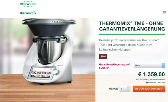TM6 Thermomix® TM6 mit Garantieverlängerung € 14,00 € 1399,00 inkl % MwSt, versandkostenfrei Lieferzeit 2 Wochen Versandkosten Die Kosten für Verpackung und Versand betragen € 5,00 Ab einem Warenwert von € 40,00 übernimmt Vorwerk die Versandkosten.