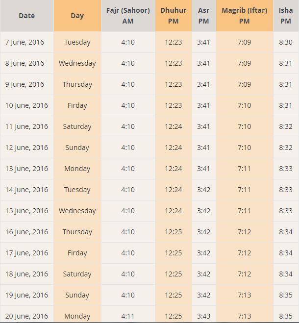Printable Ramadan Prayer Time Table for each part of the world Below is the Ramadan 16 timetable for Makkah If you are looking for the Ramadan Timetable other than for Makkah, please click on change button and type in your city name. Western Date Day of Week Hijri Date;. Ramadan is fast approaching in Dubai I didn’t realize that it’s already June 18 This event is going to be a time for fasting The UAE is a Muslim country and nonMuslims are expected to follow certain rules to avoid penalties and to respect the practices observed in this month.