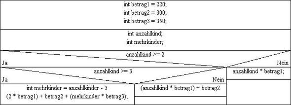 Hier werden mehrere Variable verwendet In Java und vielen anderen Programmiersprachen müssen Variablen vor der Verwendung deklariert werden und ihr Datentyp benannt werden Die Deklaration stellt keine logische Anweisung dar und wird deshalb nicht in das Struktogramm übernommen Die.