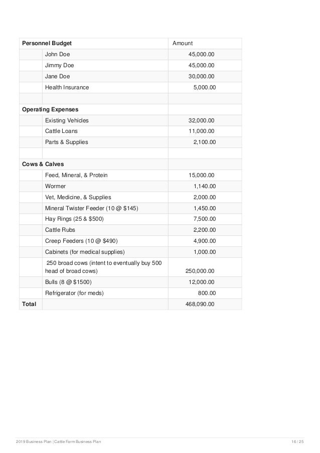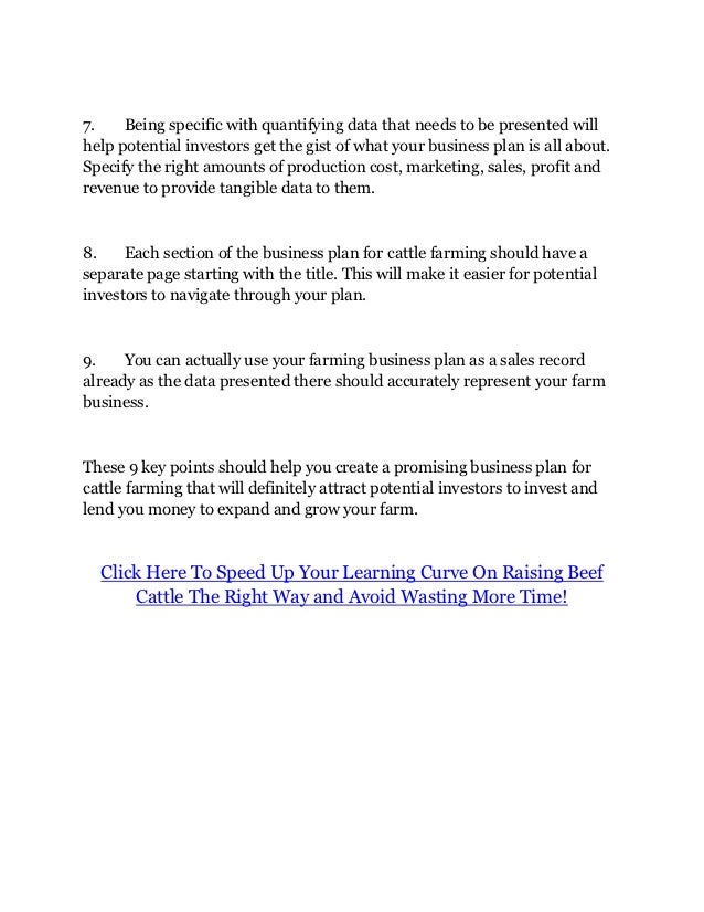 1 A business plan serves multiple purposes Lacy says a business plan serves two purposes First, it helps guide the business management team in making decisions to meet specific objectives and goals Second, it demonstrates the feasibility of the proposed business potential to investors and/or lenders for the purpose of acquiring capital 2. Of 2 water sources located on the farm one for livestock and one for farm buildings and residential buildings See Production Plan in the Appendix Marketing labor land sales We continue to research and watch new trends and options for beef output and new options for types of hay. This article will outline how to start the cattle farming business, and the beef cattle farming business plan – PDF, Word Cattle farming is a lucrative business, providing income for millions of people, but there are some essential things you need to do before you venture into the cowcalf production business.