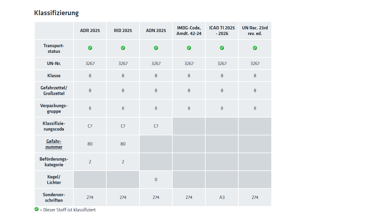 This webpage displays the GHS pictograms applicable to sectors other than transport of dangerous goods (ie pictograms with the red border) the pictograms for transport of dangerous goods (usually referred to as "labels" in transport of dangerous goods regulations) applicable to transport classes for which an equivalent GHS hazard class exists. Gefahrzettel und Warntafel Neben dem Gefahrzettel soll eine zusätzliche Warntafel aufs spezifische Gefahrgut hinweisen Diese orangefarbenen rechteckigen Tafeln führen zwei Zahlengruppen, die untereinander stehen die Gefahrnummer (oben) und die Stoffnummer (unten) Durch die Gefahrnummer (auch KemlerNummer) lässt sich die Gefahr, die von dem transportierten Gefahrgut ausgeht, spezifizieren. · ADR · Klasse 8 Ätzende Stoffe · Gefahrzettel 8 · IMDG, IATA · Class 8 Corrosive substances · Label 8 · 144 Verpackungsgruppe · ADR, IMDG, IATA II · 145 Umweltgefahren · Marine pollutant no · 146 Besondere Vorsichtsmaßnahmen für den Verwender Nicht anwendbar · KemlerZahl 80 · EMSNummer FA,SB · Segregation groups Acids.