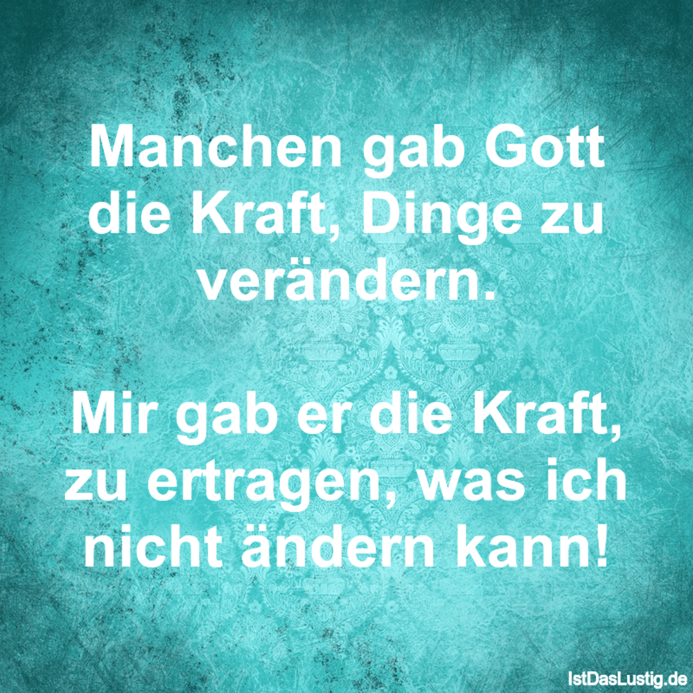 Lieber Gott, gib mir Ruhe und Gelassenheit aber um Himmelswillen gib mir keine Kraft, denn wenn ich Kraft habe,. Lieber gott gib mir bitte die weißheit manche menschen zu verstehen, gib mir geduld sie zu ertragen gib mir die güte ihnen zu verzeihen aber bitte lieber gott gib mir keine kraft denn wenn ich kraft habe hau ich ihnen aufs maul D Bitte habe Geduld sprüche geduld sprüche herr gib mir keine kraft herr gib nur Geduld aber keine kraft lieber gott gib mir die weisheit meinen chef zu begreifen. Lieber Gott, gib mir die Weisheit einige Menschen zu verstehen, die Geduld sie zu ertragen, die Güte ihnen zu verzeihen, aber bitte gib mir keine Kraft denn wenn ich Kraft habe, haue ich ihnen aufs Maul!.